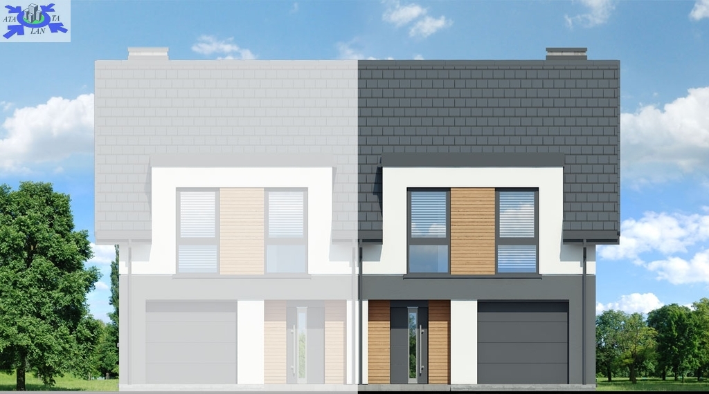 Poszczególne połówki postawione są na działkach o powierzchni 356 oraz 318 m2. Dom wybudowany według projektu Archeon "Dom w riveach 8 (GB)".