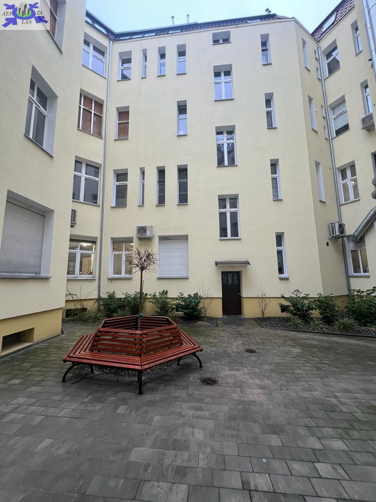 Odrestaurowana kamienica przy al. Jana Pawła II z zadbanym patio.