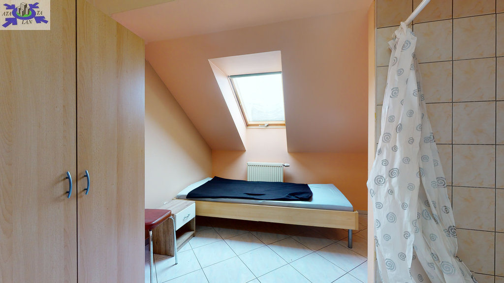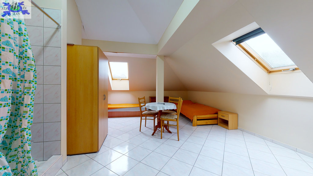 - w budynku wydzielona jest część hotelowa- parter (hol, aneks kuchenny, 9 pokoi 2 i 3 osobowych, 2 łazienki wyposażone po 2 kabiny prysznicowe, 4 toalety, korytarz). Nad częścią hotelową znajduje się poddasze (hol, kuchnia z jadalnią, toaleta, 4 pokoje w tym 3 z kabinami natryskowymi i umywalkami).