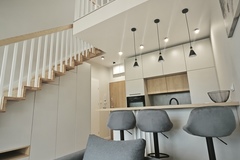 Kuchnia w pełni umeblowana i wyposażona w sprzęt AGD (płyta elektryczna, piekarnik, zmywarka, lodówka, okap)