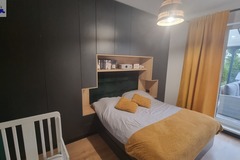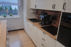 Meble wykonane na wymiar gwarantują funkcjonalność i estetykę. Nowoczesna kuchnia została w pełni wyposażona - znajduje się tu wyspa, lodówka, piekarnik oraz zmywarka. Stylowa łazienka oferuje prysznic typu walk-in oraz praktyczną zabudowę pod pralkę i suszarkę.