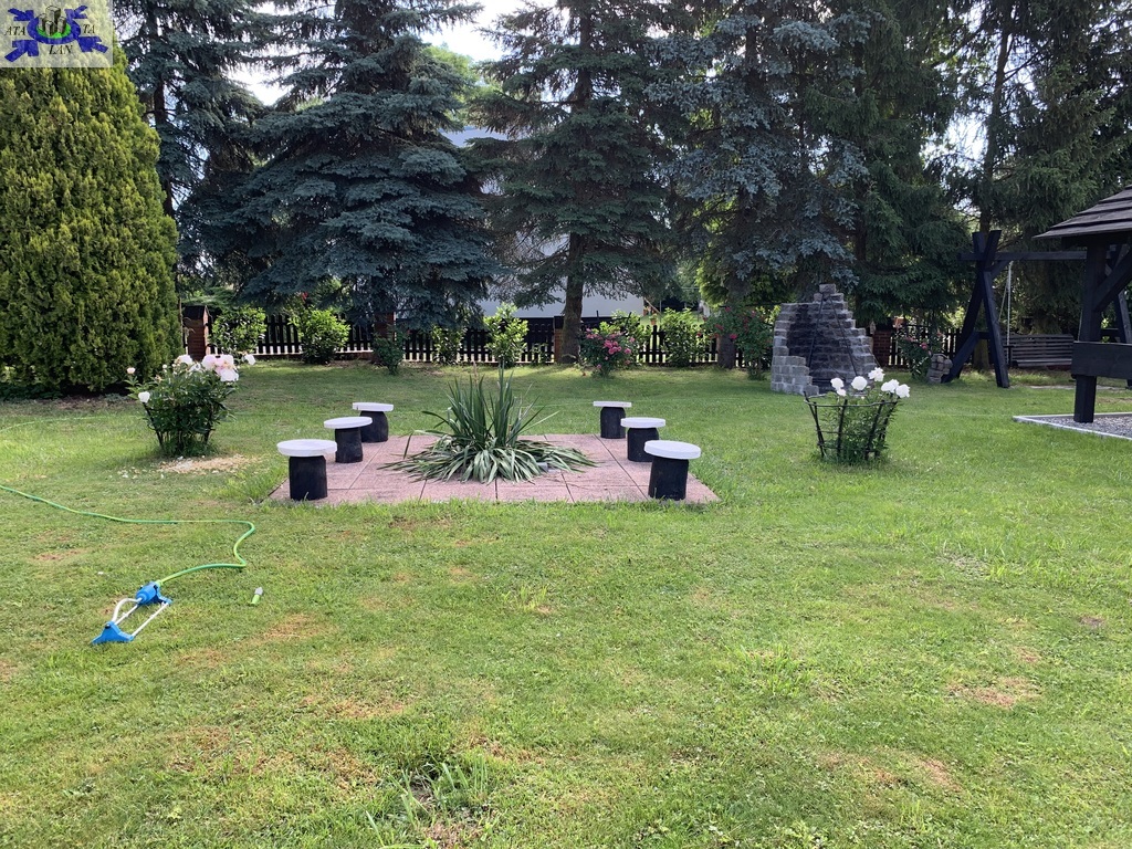 Teren wokół domu zadbany, regularnie pielęgnowany, zorganizowana strefa wypoczynku z dużą wiatą i grillem oraz huśtawką.