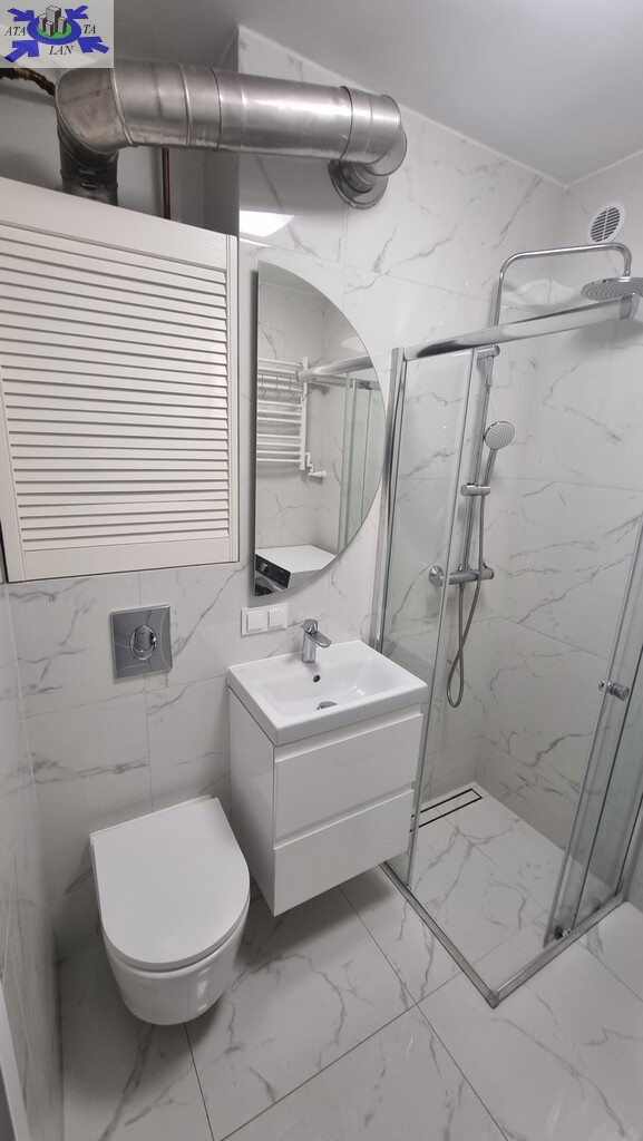 - w łazience kabina prysznicowa z pralko suszarką.