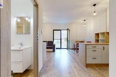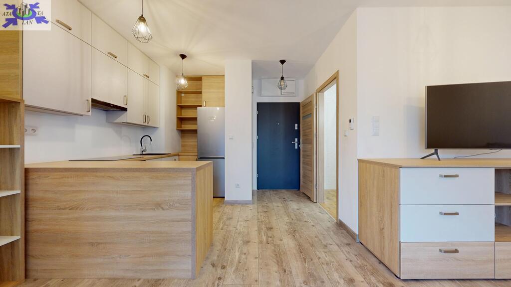 Pokój z aneksem kuchennym i wyjściem na balkon. Łazienka razem z wc, w przedpokoju szafa w zabudowie.