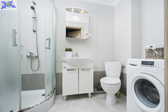 Mieszkanie jest umeblowane. Łazienka oraz kuchnia wyposażone są w niezbędny sprzęt AGD chłodziarko-zamrażarkę, zlewozmywak, kuchenkę elektryczną, piekarnik oraz pralkę.