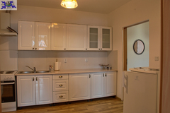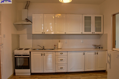 Kuchnia wyposażona jest w kuchenkę elektryczną z piekarnikiem, pochłaniacz, nowe białe meble kuchenne i lodówkę .