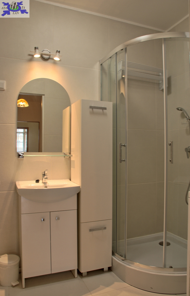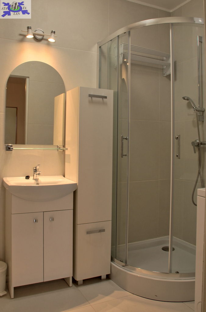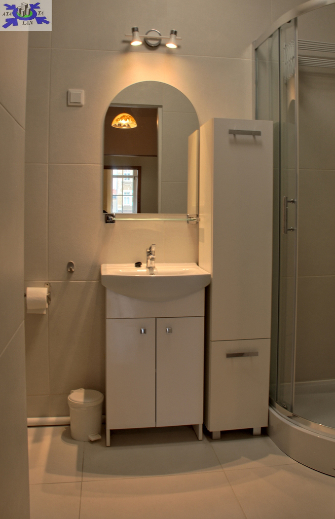 W łazience oprócz wskazanego wyżej podgrzewacza wody znajduje się kabina prysznicowa, umywalka z szafką oraz sedes, jest też miejsce na pralkę.