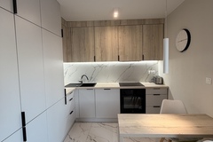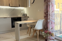 Mieszkanie znajduje się na 6. piętrze i zostało zaprojektowane z dużym wyczuciem stylu - wszystkie meble wykonano na wymiar, dzięki czemu wnętrze jest nie tylko nowoczesne, ale też wyjątkowo funkcjonalne. Jasny salon z rozkładaną sofą tworzy przytulną strefę wypoczynkową, a wydzielona część jadalniana doskonale sprawdza się do codziennych posiłków lub pracy przy laptopie. Aneks kuchenny został w pełni wyposażony w sprzęt AGD w zabudowie - zmywarkę, płytę, piekarnik i lodówkę. W łazience znajduje się prysznic oraz pralka, a pojemna szafa w zabudowie zapewnia dużo miejsca do przechowywania. Z salonu można wyjść na przestronny balkon z przyjemnym widokiem, idealny na poranną kawę lub wieczorny relaks.