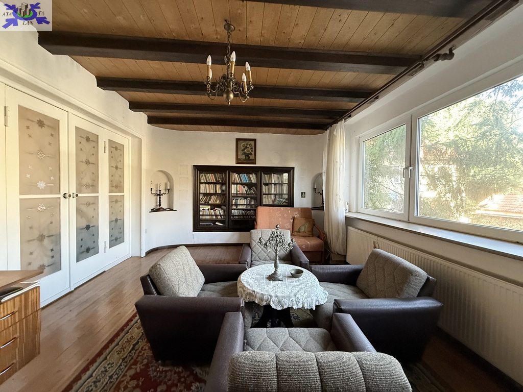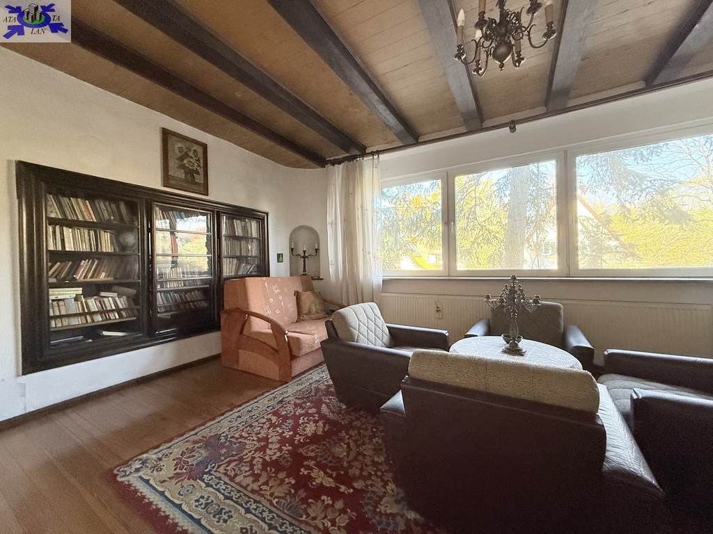 Dom o powierzchni ok. 140 m2 obejmuje przyziemie z pokojem i łazienką oraz pomieszczeniami gospodarczymi, parter z dwoma dużymi pokojami (w tym jeden z wykuszem), kuchnią, łazienką, garderobą, hall'em i zabudowaną werandą, piętro z dwoma pokojami, łazienką, balkonem od strony ogrodu oraz użytkowy strych wnętrza zachowały wiele oryginalnych detali, takich jak drewniane sufity i podłogi, co pozwala na stworzenie wnętrza z charakterem. Budynek wymaga modernizacji i aranżacji według własnej wizji, co stanowi otwartą przestrzeń dla przyszłego właściciela.