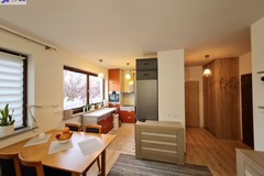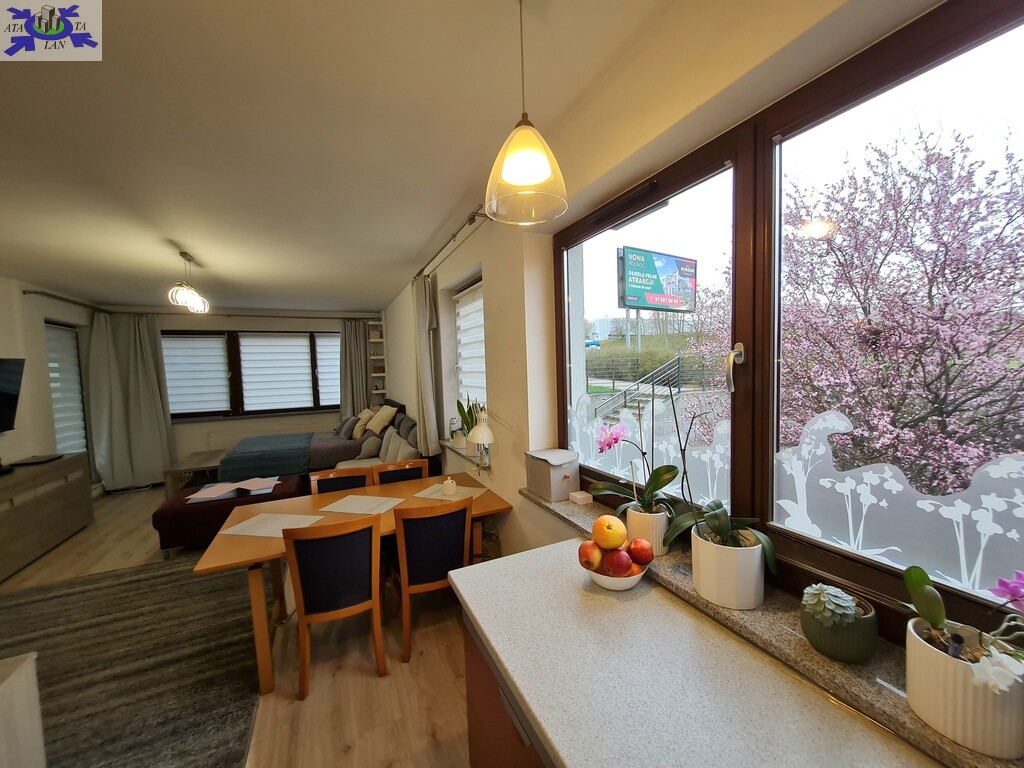 przestronny salon z kuchnią i wyjściem na zamknięty balkon, sypialnia,
