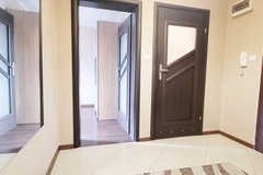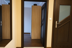 - przestronny przedpokój w którym znalazło się miejsce na pojemną szafę typu Komandor. Podłogę wyłożono terakotą, ściany wygładzono i pomalowano.
