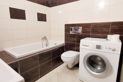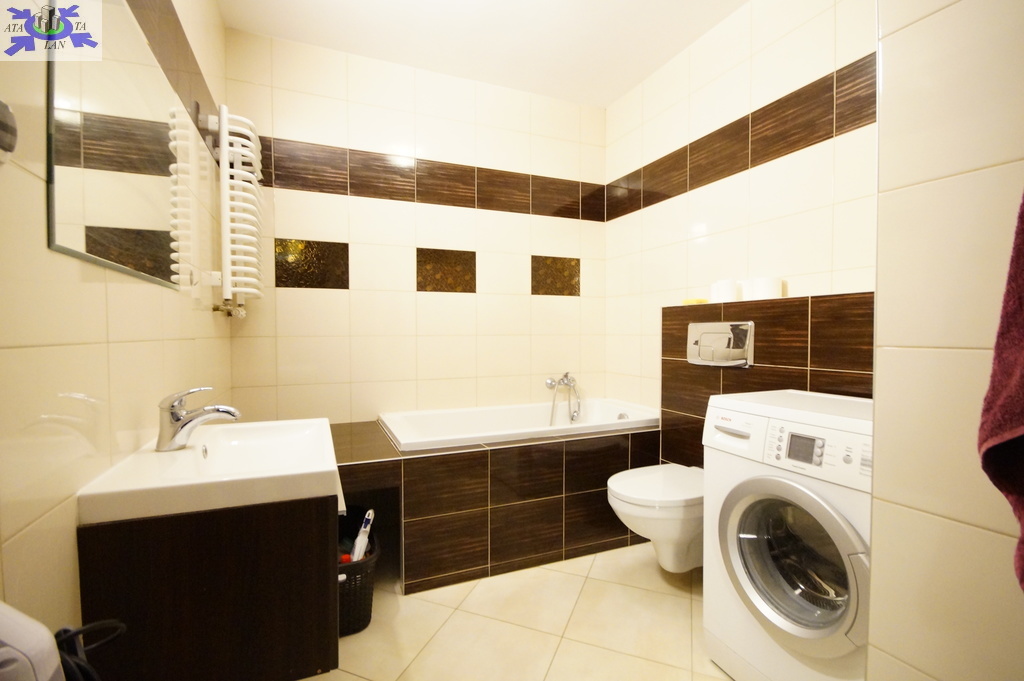 - łazienkę o pow. ok. 4,5 m2 wyłożoną glazurą i terakotą. W łazience znajdziemy również oprócz wanny, umywalki i wc także pralkę.