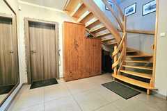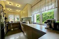 Na powierzchnię parteru budynku (ok. 130 m2), pełniącego jednocześnie rolę strefy dziennej domu, składają się otwarta, jasna kuchnia, przestronny salon połączony z jadalnia (z którego wychodzi się na taras oraz pięknie zaaranżowany ogród), łazienka z wc, pomieszczenie sanitarno - gospodarcze, pomieszczenie wielofunkcyjne (obecnie zaaranżowane na gabinet, pracownię oraz łazienkę z WC), korytarz i wiatrołap. Na piętro nieruchomości prowadzą piękne, drewniane schody. W górnej części domu (ok. 90 m2), pełniącej głownie strefę nocną, stanowią 4. sypialnie, garderoba, główna łazienka z pralnią oraz suszarnią, korytarz.