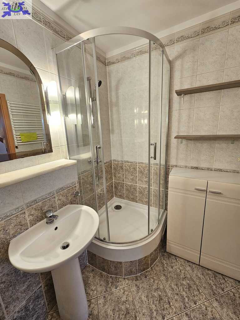 I poziom - 87 m2 kuchnia kompletnie umeblowana meblami na wymiar z pełnym wyposażeniem (lodówko-zamrażarka, kuchenka elektryczna, płyta grzewcza, zmywarka, pralka), mniejsza łazienka z kabiną prysznicową, pokój dzienny o pow. 24 m2 z balkonem oraz 2 niezależne pokoje o pow. 15 m2 każdy. W zabudowie szafy typu "komandor" - w przedpokoju oraz pokoju na górze.