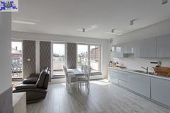 - Przestronny salon z otwartą kuchnią Stylowo urządzony salon z bezpośrednim wyjściem na duży balkon oraz otwartą kuchnią, wyposażoną w nowoczesny sprzęt AGD.