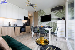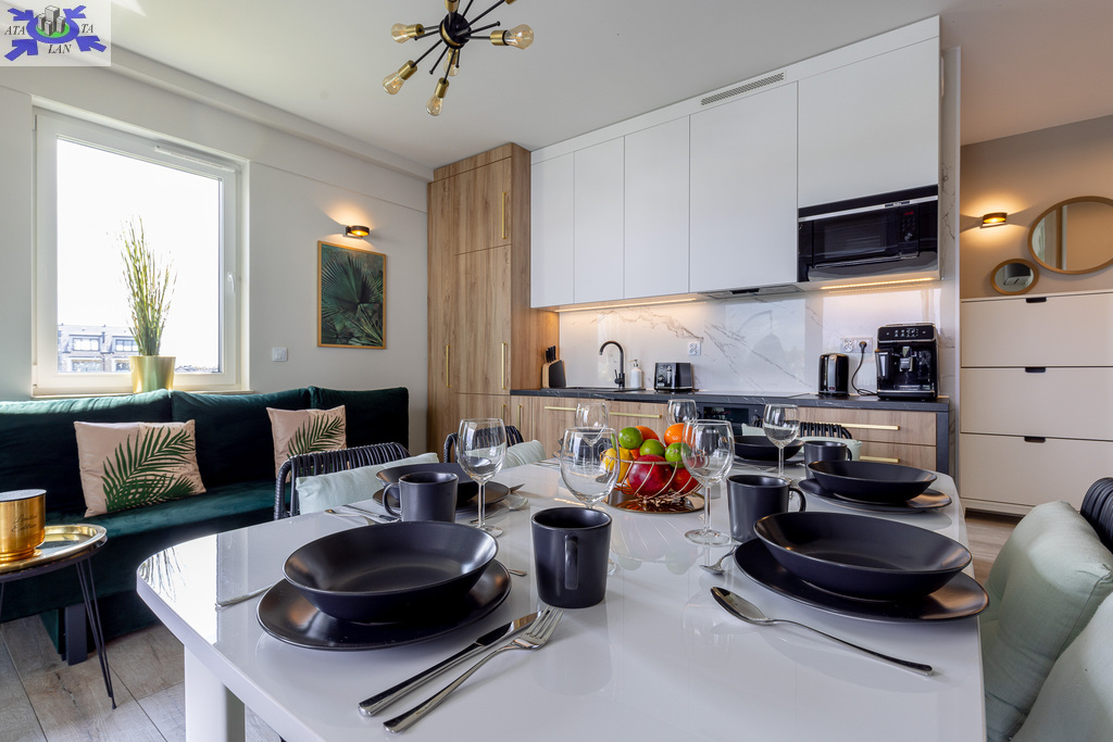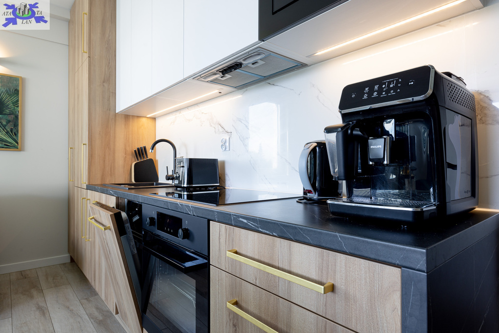 Kuchnia wyposażona w meble kuchenne, oraz sprzęt AGD płyta indukcyjna, zmywarka, piekarnik lodówka, okap, mikrofalaŁazienka w nowoczesnej glazurze i terakocie. Baterie i armatura renomowanych producentów.W każdym pokoju jest klimatyzacja, z salonu wyjście na przestronny taras.