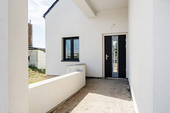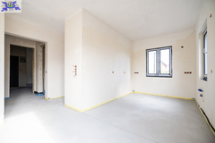 Dom wybudowany został z wysokiej jakości materiałów. Zastosowano trzyszybowe okna PCV z roletami zewnętrznymi oraz czujnikami alarmowymi, ściany wykonano z bloczków silikatowych i ocieplono styropianem grafitowym o grubości 20 cm, dach pokryty jest dachówką ceramiczną Roben, a poddasze przygotowane jest do docieplenia. Wnętrza wykończono tynkiem silikonowym, okna, rynny i dachówka są w kolorze antracytowym. Zainstalowano ogrzewanie podłogowe gazowe, które jest już uruchomione i działające, wykonano podłączenie do sieci kanalizacyjnej, rozprowadzono instalacje pod alarm, monitoring, domofon oraz bramę wjazdową. Garaż wyposażony jest w bramę automatyczną. Wykonana została instalacja deszczowa z możliwością zagospodarowania wody do podlewania ogrodu lub oczka wodnego.
