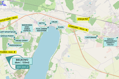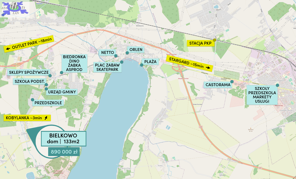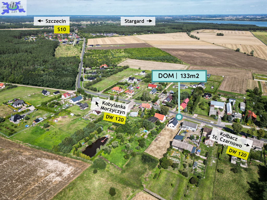 Istnieje możliwość wybudowania dodatkowego garażu za domem oraz parkowania czterech samochodów na terenie posesji. W najbliższej okolicy znajdują się sklepy, markety, szkoła podstawowa, przedszkole, urząd gminy i stacja paliw w odległości 3-5 minut jazdy samochodem. Dojazd do drogi S10 zajmuje około 5 minut, plaża w Zieleniewie około 10 minut, Prawobrzeże Szczecina 15 minut, a Płonia znajduje się w odległości około 10 km.