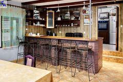 kącik barowy (ok. 5 m2) wyposażony w stylowe stołki barowe (hokery), niezbędne meble i sprzęty (m. in. lodówka, zmywarka),