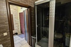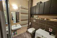 Łazienka wyposażona prysznic wolnostojący, umywalkę, wc i pralkę.