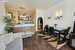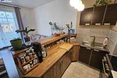 Kuchnia z meblami wyposażona w lodówko-zamrażarkę, kuchenkę elektryczną i okap.