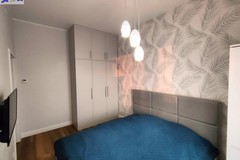 Kuchnia została wykonana z dbałością o funkcjonalność i estetykę drewniana zabudowa, czarne detale i dobrze rozplanowane oświetlenie tworzą elegancką całość. Sypialnia, oddzielona od salonu, zapewnia prywatność i również posiada wyjście na loggię, co optycznie powiększa przestrzeń.
