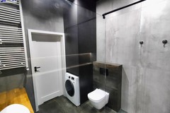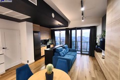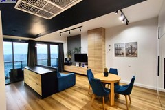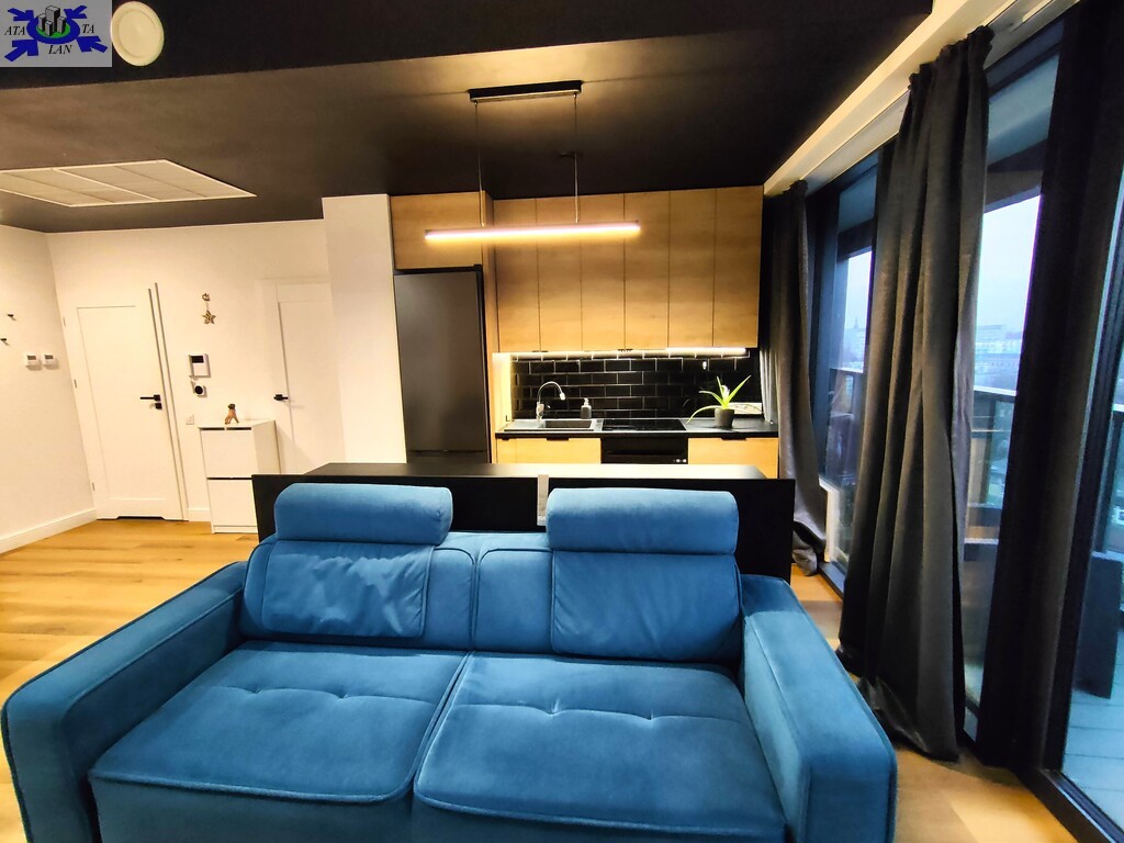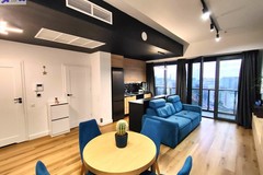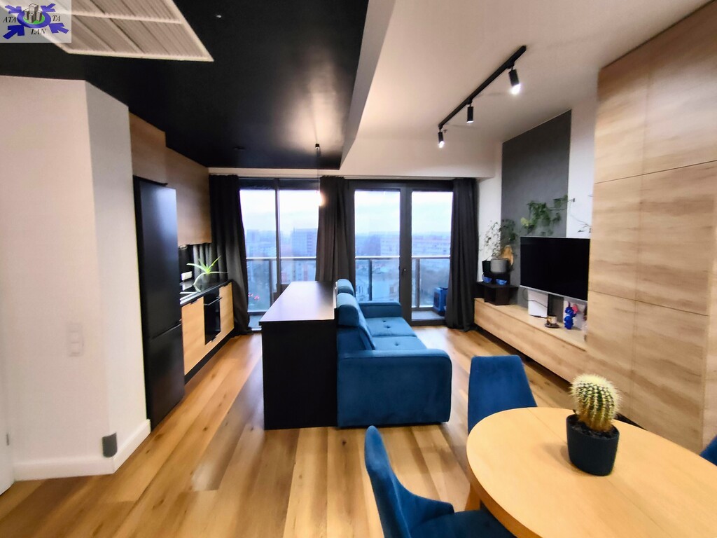 Apartament wykończony w nowoczesnym, spójnym stylu, z wykorzystaniem materiałów wysokiej jakości. Jasny salon połączony z aneksem kuchennym tworzy komfortową, dobrze doświetloną przestrzeń dzienną. Duże przeszklenia prowadzą na loggię i zapewniają atrakcyjny widok na centrum miasta.