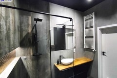 Łazienka w standardzie premium wielkoformatowe płyty o industrialnym charakterze, czarna armatura, prysznic typu walk-in oraz podświetlane wnęki nadają wnętrzu nowoczesny i minimalistyczny styl.