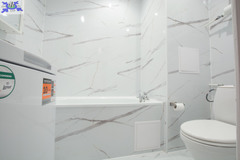 - ładnej łazienki po remoncie, z wanną, nową pralką, szafką z umywalką oraz wiszącą szafkę z lustrem.