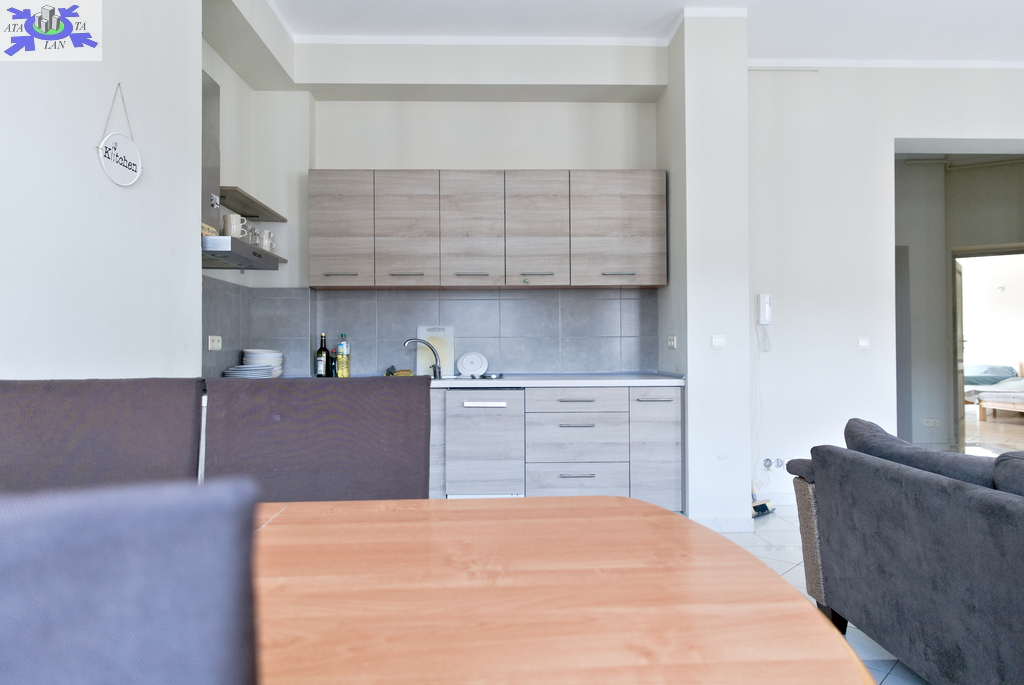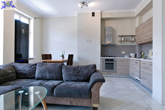 - rozległy salon z dużymi oknami połączony z jadalnią i w pełni wyposażoną kuchnią