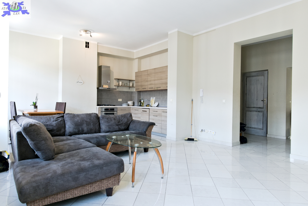 przejściowa łazienka, kuchnia otwarta na salon, zabytkowy, ale odrestaurowany budynek