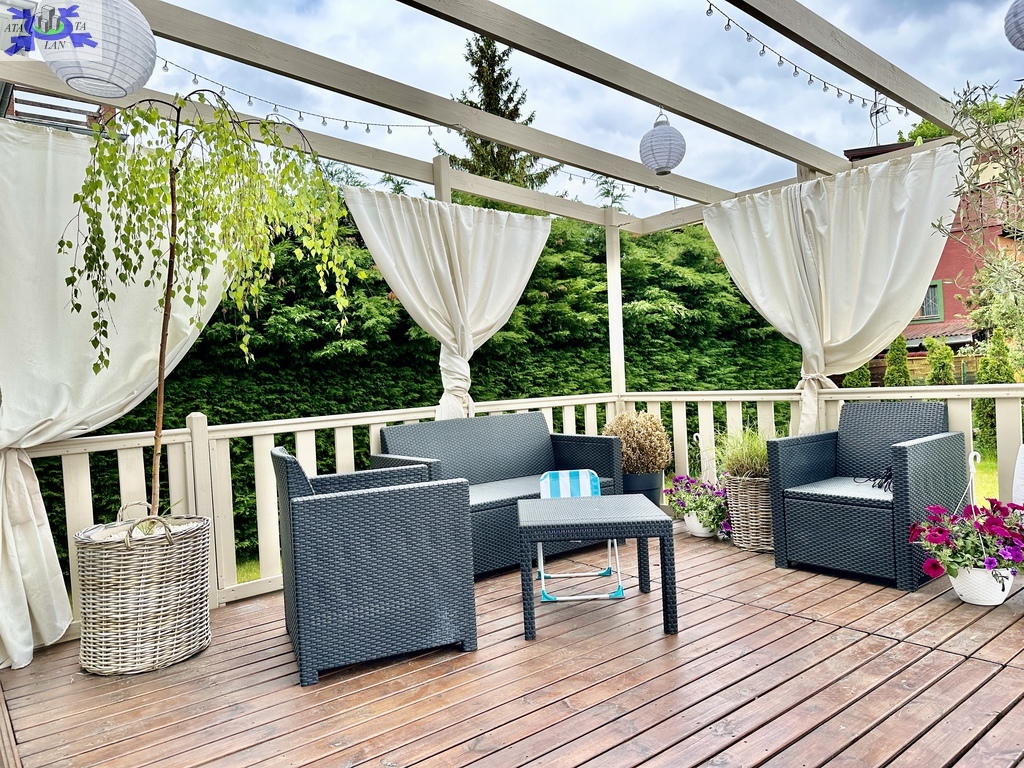 Do sprzedania dom 5 pokoi w zabudowie bliźniaczej w prestiżowej dzielnicy Pogodno, o powierzchni całkowitej 215 m2 , o powierzchni użytkowej 175 m2. W przyziemiu znajduje się garaż , na parterze salon z kuchnią , przedpokojem i wc . Na piętrze są 3 pokoje i łazienka. Poddasze to jedno duże otwarte pomieszczenie. Dom usytuowany jest na działce ok. 332 m.kw . Ogród z zadbaną zielenią w postaci trawy i nasadzeń drzewnych wokół działki. Od strony salonu znajduje się taras z aranżacją w postaci mebli ogrodowych, pięknych donic z mikro drzewkami i przeciwsłoneczną pergolą. Przytulny salon z kominkiem, dużym wypoczynkiem, po łączony z kuchnią i stołem do wspólnych posiłków. Kuchnia w pełni wyposażona, jasna, z oknem. Przedpokój i wc na dole. Jeśli chodzi o piętro - znajdują się tam 3 ustawne pokoje i łazienka z prysznicem. Dom posiada poddasze użytkowe już zaaranżowane, w którym mieści się spora sypialnia. Całość bardzo gustowna, utrzymana w spójnej jasnej kolorystyce. Nieruchomość wybudowana wg nowej technologii . Fundamenty , ściany, posadzki ocieplone styropianem 15 . Poddasze ocieplone wełną skalną 20 cm .W całości ogrzewanie gazowe podłogowe (łącznie z garażem) , które w chłodne dni można wspomagać lub zastąpić kominkiem. Całość posiada okna 3 szybowe z oknami balkonowymi typu HS. Zapraszam serdecznie na prezentację.