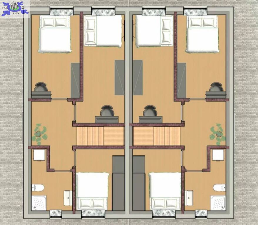 Dom składa się z 4 pokoi, dużego salonu na parterze połączonego z aneksem kuchennym z wyjściem na słoneczny taras, 2 łazienek, 3 sypialni na piętrze oraz pomieszczenia gospodarczego.