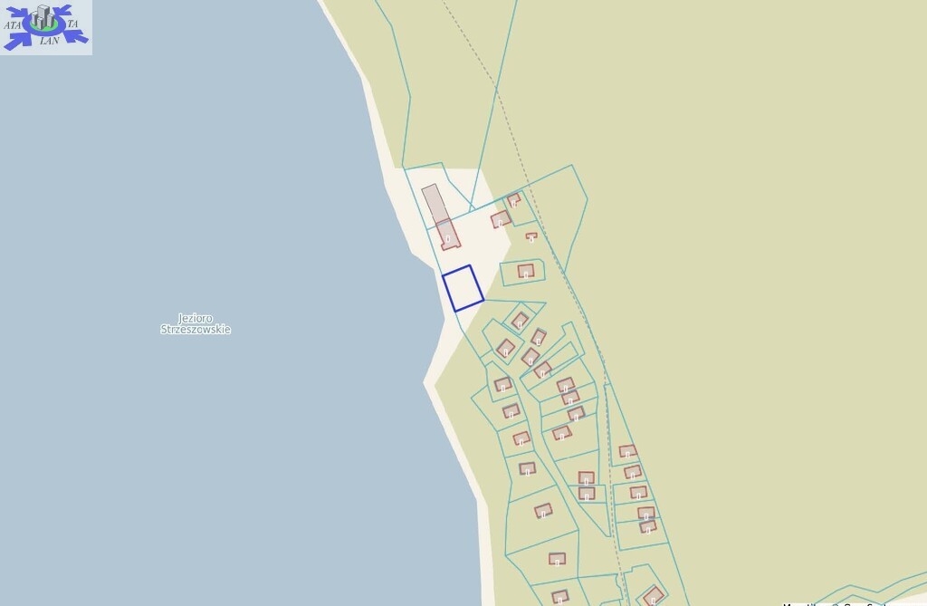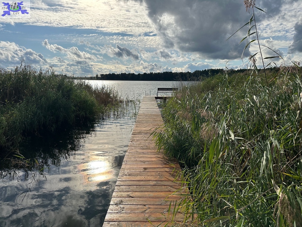Działka o regularnym kształcie prostokąta, co pozwala na jej łatwe zagospodarowanie, a jej dłuższa granica przylega do jeziora.