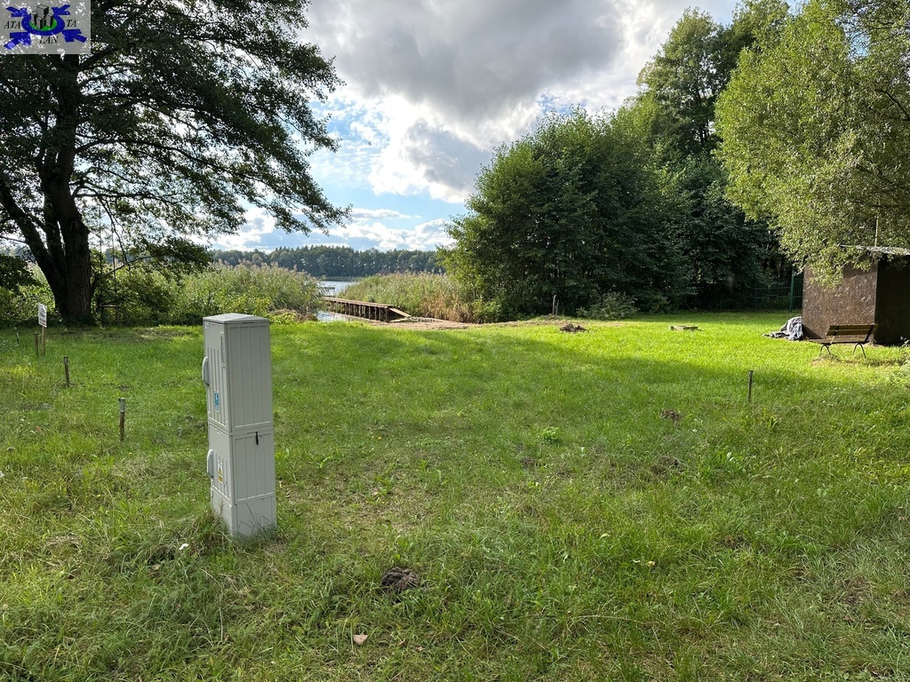 Działka rekreacyjna położona nad jeziorem z własną linią brzegową oraz pomostem.