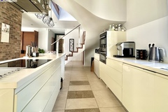 -otwarta kuchnia z oknem, pełna zabudowa meblowa oraz sprzęt AGD (płyta indukcyjna, piekarnik, mikrofala, lodówka side-by-side z kostkarką, krajalnica i inne),