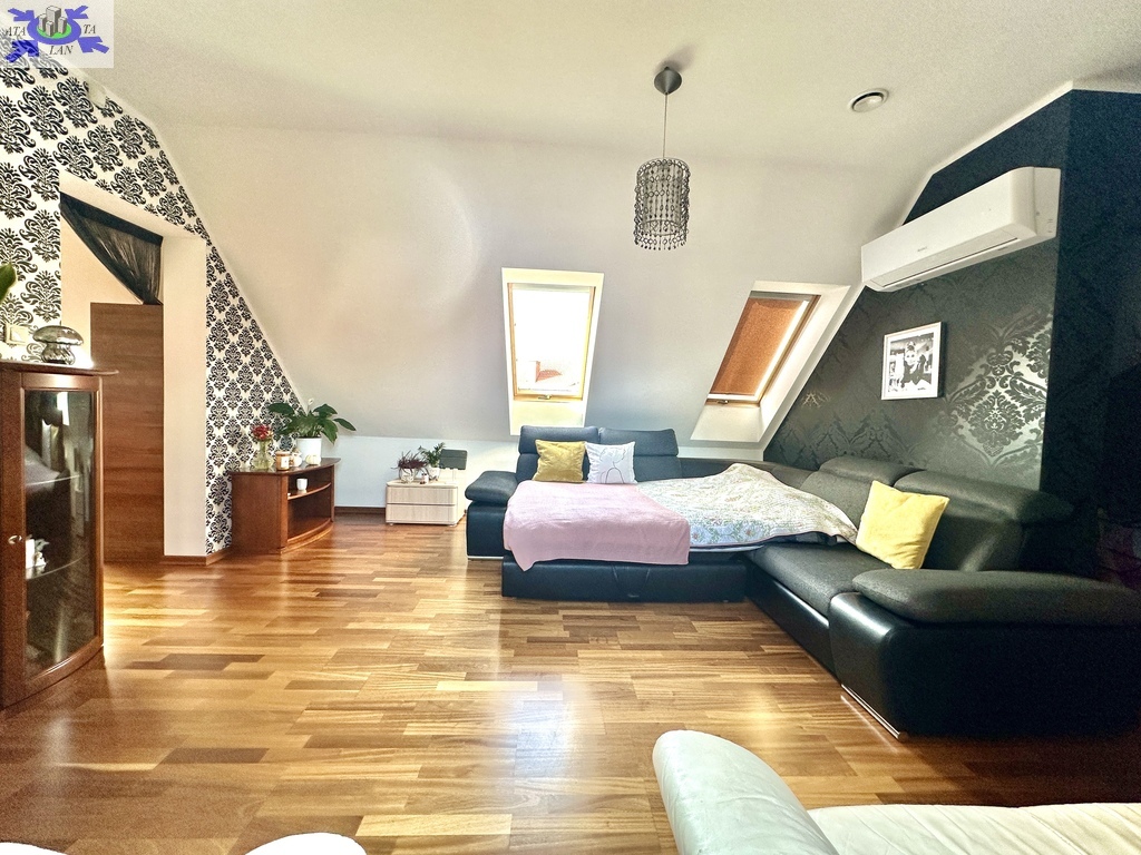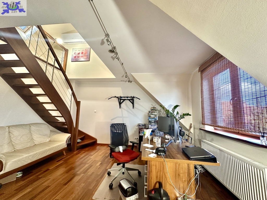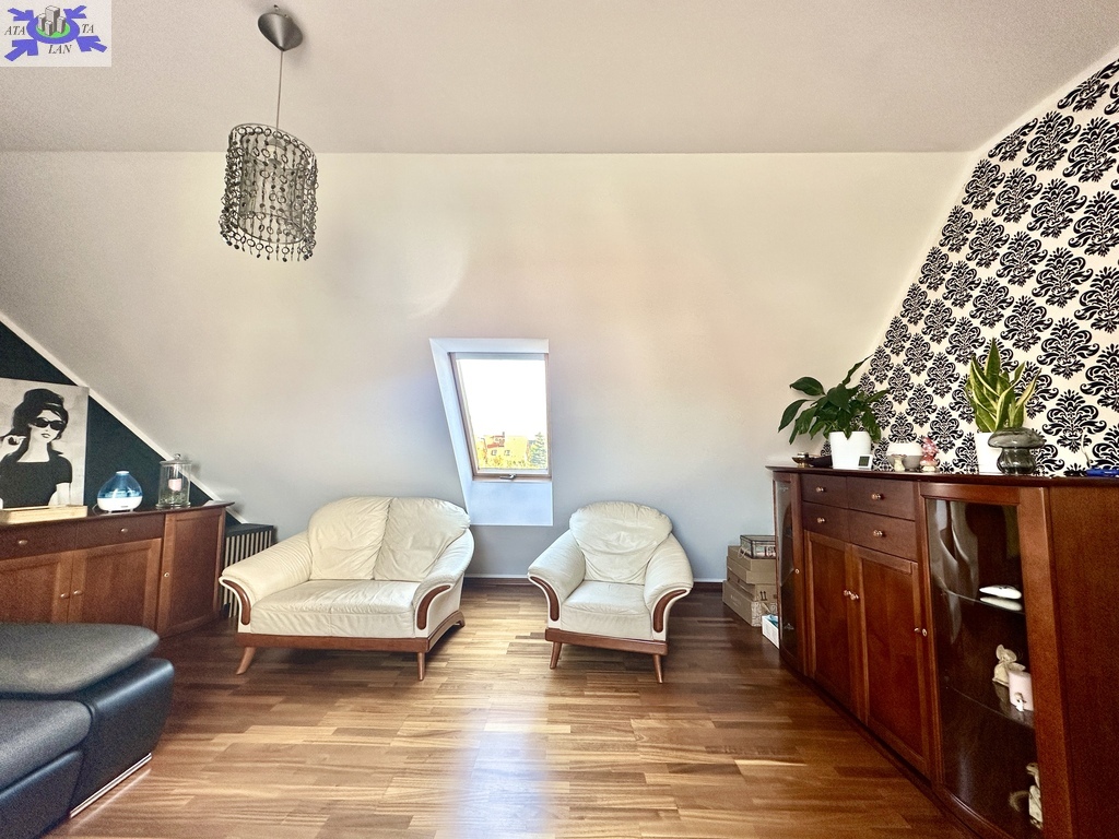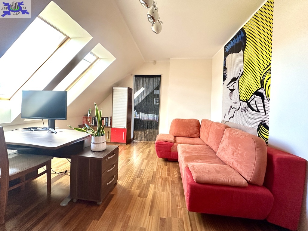-przestronny pokój z antresolą i małą garderobą,