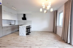 - salon z aneksem kuchennym (27,5 m2), kuchnia w zabudowie meblowej, wyposażona w sprzęt AGD (lodówka, zmywarka, płyta indukcyjna,