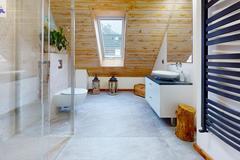 - łazienka z prysznicem, w której znajduje się piec dwuobiegowy Bosch w zabudowie