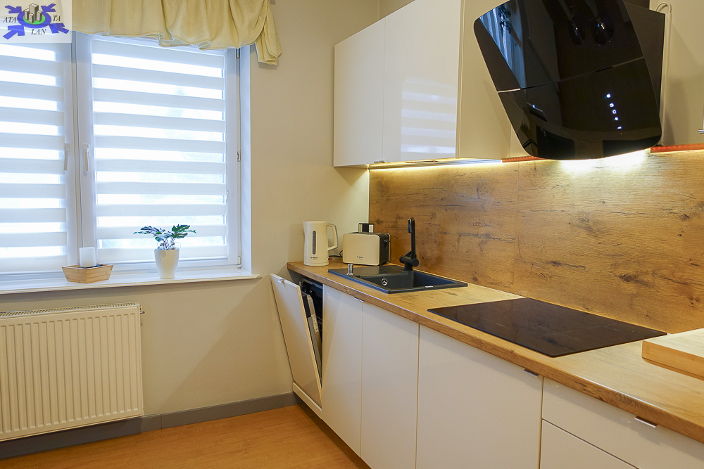 * druga kuchnia 11,7 m2 z oknem i z zabudową meblową wraz z urządzeniami AGD lodówka z zamrażarką BOSCH, płyta indukcyjna BOSCH, zmywarka 45 cm ELEKTROLUX, piekarnik z mikrofalówką BOSCH.