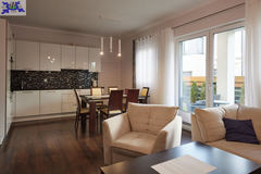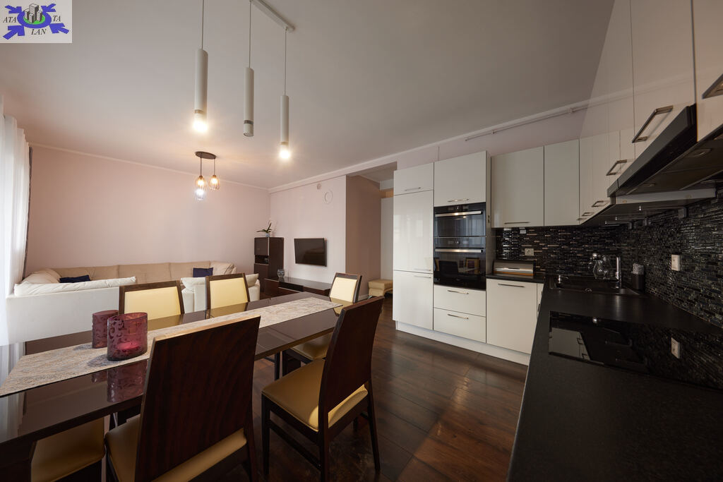 Na podłogach znajdują się panele klasy premium, a łazienka zachwyca gustowną aranżacją z dużą kabiną prysznicową. W części kuchennej zastosowano białą zabudowę meblową z czarnymi, kamiennymi blatami, co nadaje wnętrzu wyjątkowego, ekskluzywnego charakteru.