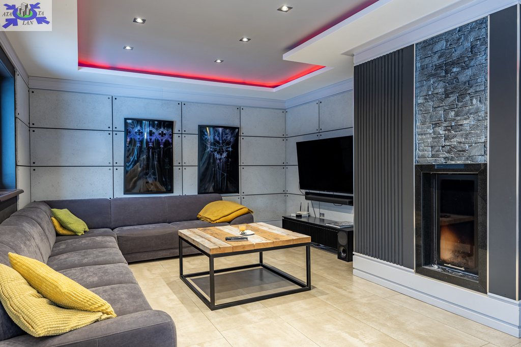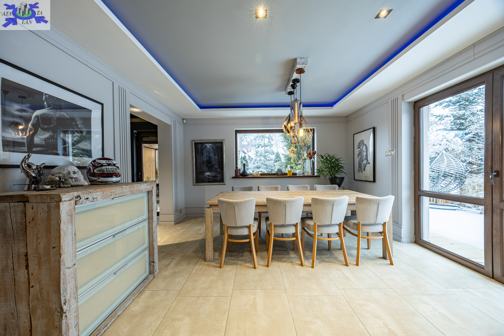 - duży salon, z częścią jadalną, kominkiem i z wyjściem na taras i ogród