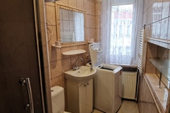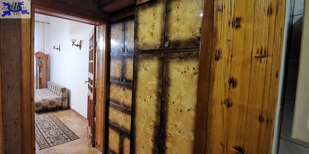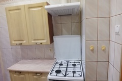 Kawalerka składa się z bardzo dużego pokoju (na wyposażeniu rozkładana sofa, meble), przedpokoju (z szafami), kuchni (z meblami, lodówką, kuchenką gazową z piekarnikiem, okapem, zlewozmywakiem) oraz łazienki z kabiną prysznicową, umywalką, pralką oraz wc (łazienka z oknem).