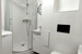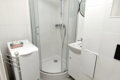 Niewielka łazienka - kabina prysznicowa, umywalka, toaleta i pralka.