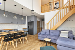Salon zachwyca podwójną wysokością (5,5m), która w połączeniu z wysokimi, dwukondygnacyjnymi oknami daje niezwykłe poczucie przestrzeni i światła. Bez problemu mieści się tu duża sofa, fotel idealny do czytania książki oraz strefa wypoczynkowa dla całej rodziny.