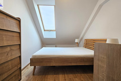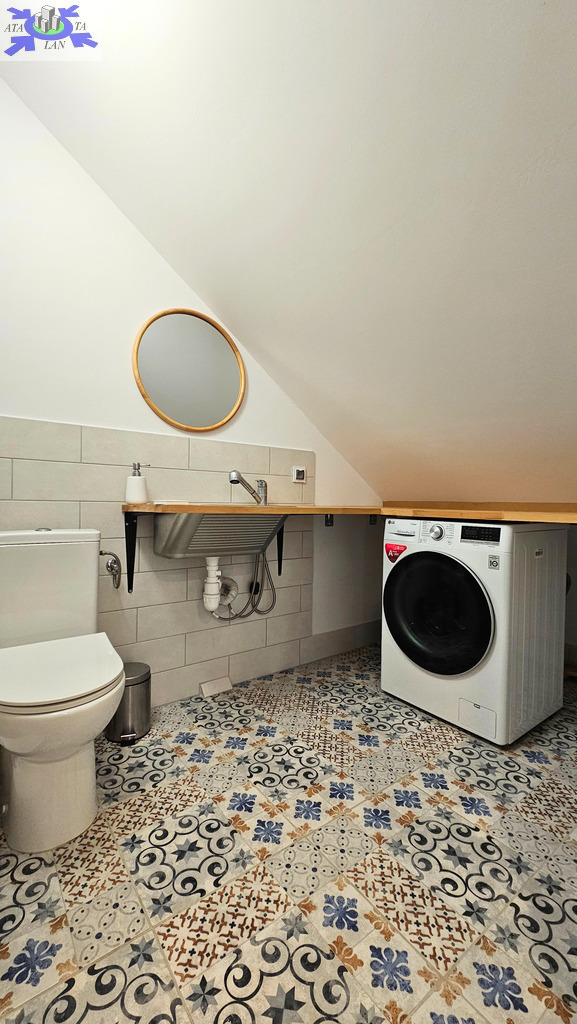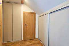 Dalej w korytarzu zaadaptowano miejsce do przechowywania (schowki pod skosami), pralnię z dodatkowym wc oraz przytulną sypialnię z klimatyzacją.