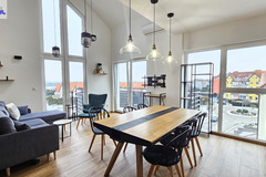 W strefie dziennej zastosowano ogrzewanie podłogowe, które znacząco podnosi komfort użytkowania. Dodatkowo w salonie znajduje się klimatyzacja, zapewniająca komfort termiczny w cieplejsze dni. Na podłodze położono panele winylowe - wyjątkowo trwałe i odporne na uszkodzenia, co jest szczególnie istotne przy małych dzieciach.