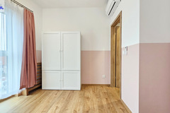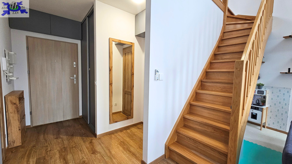 Na dole mieści się również drugi pokój wyposażony w klimatyzację, który aktualnie pełnił funkcję pokoju dziecięcego. W przedpokoju mieści się duża szafa w zabudowie, która rozwiązuje problem przechowywania codziennych rzeczy.