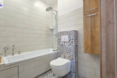 Łazienka na dole - z wanną, pełniącą również funkcję prysznica (deszczownica oraz szklany parawan) oraz z wc. Świetna opcja na domowe spa.