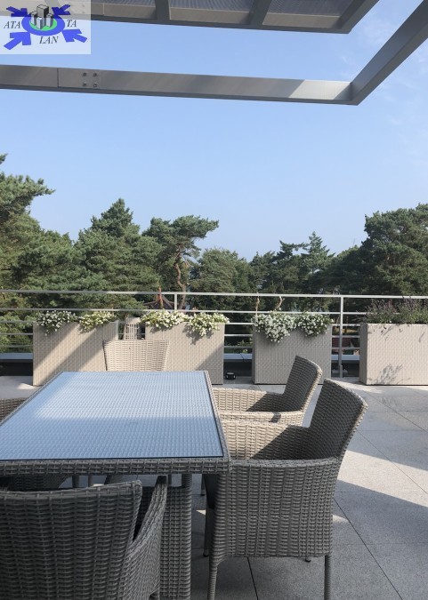 Jedyna taka nieruchomość na wybrzeżu. Apartament znajduje się w miejscowości Pobierowo około 80m od zejścia do morza w apartamentowcu z 2018r.. Wykończony w bardzo wysokim standardzie-meble na wymiar, marmury oraz armatura wysokiej klasy. Nieruchomość składa się z dużego salonu z aneksem kuchennym, łazianką z prysznicem oraz z jednej sypialni i dodatkowej łazienki z prysznicem. Wjazd windą bezpośrednio do apartamentu (bez klatki schodowej). Atutem nieruchomości jest bardzo duży słoneczny taras z widokiem na morze około 100m2 oraz dwa mniejsze tarasy o powierzchni około 35m2. Dodatkowo na dużym tarasie zlokalizowane jest jacuzzi 5 osobowe.